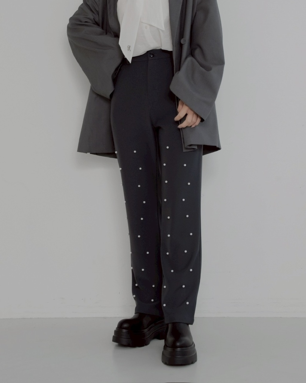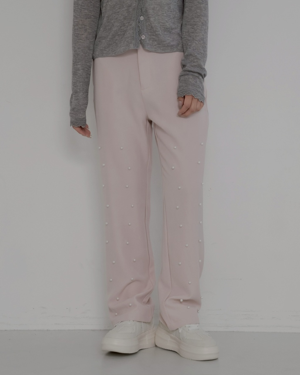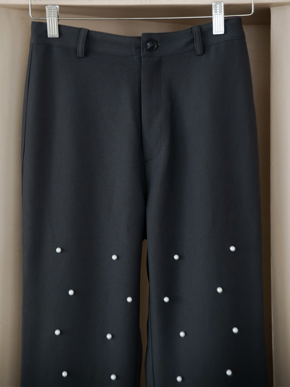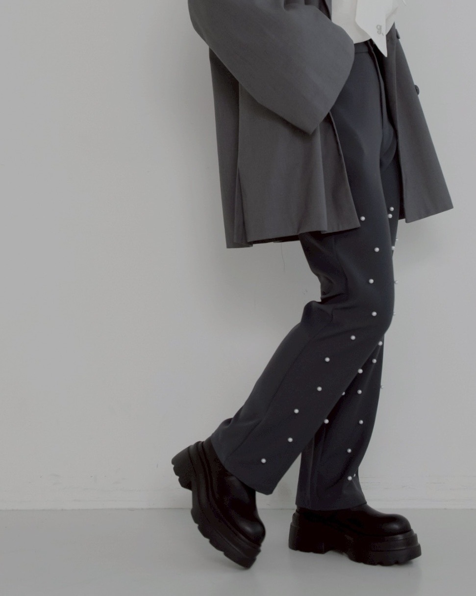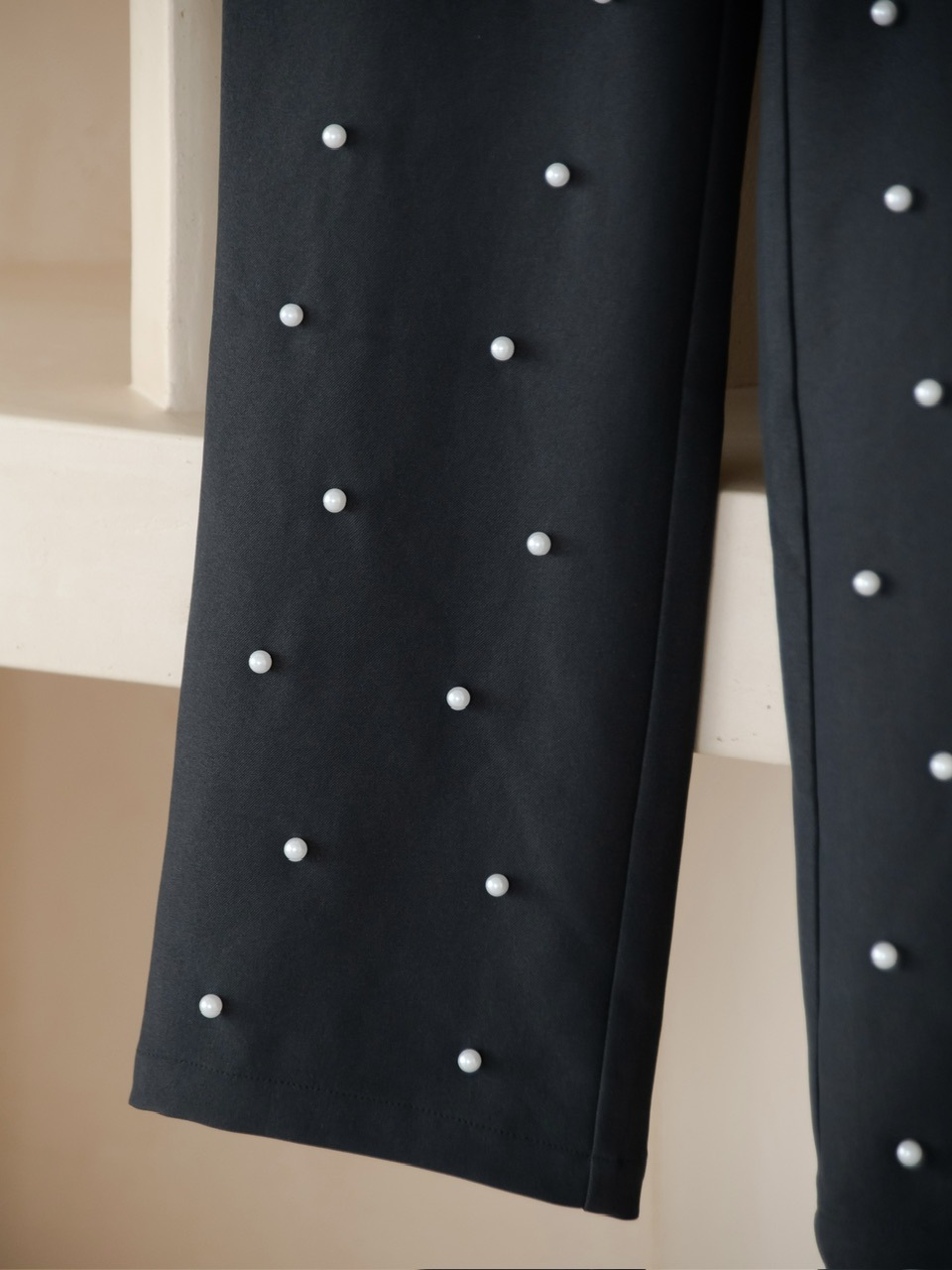 パールの装飾を施したスラックスパンツ。