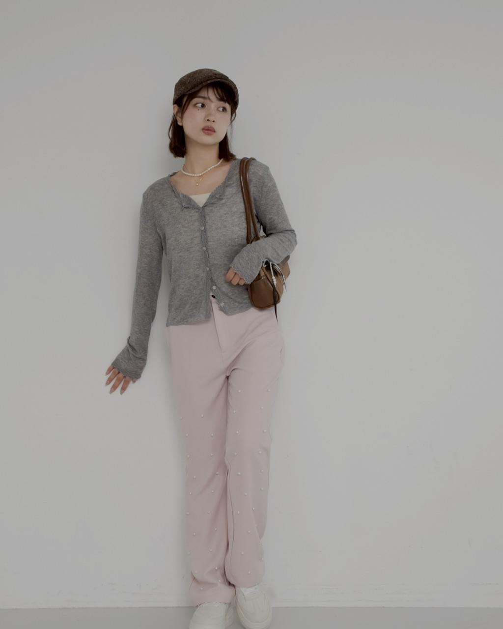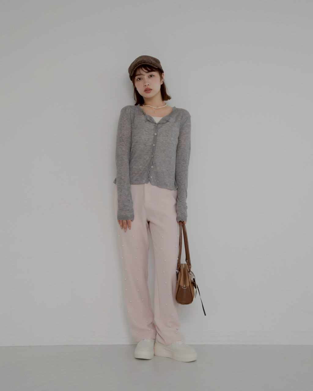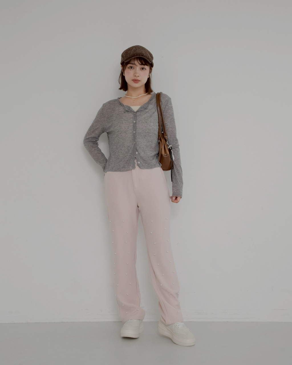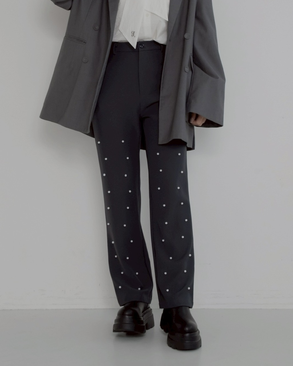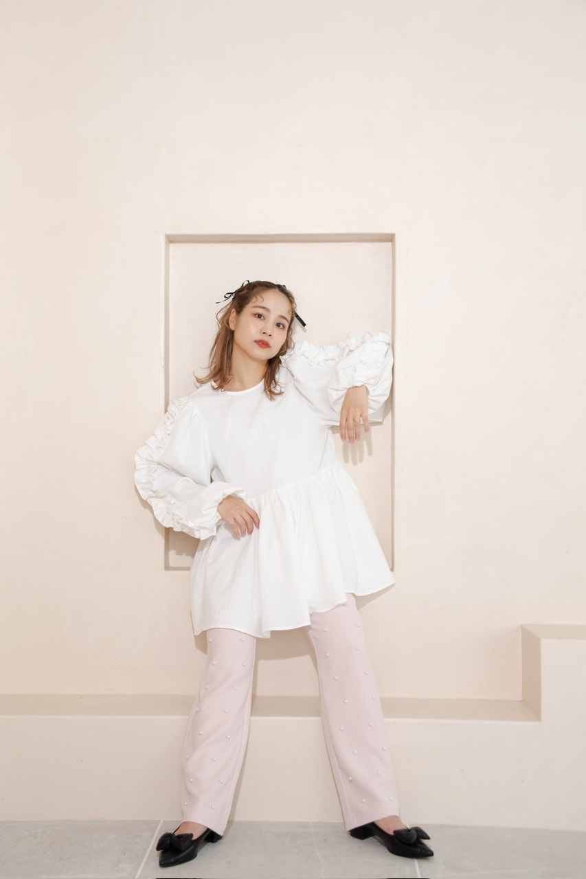 パールの装飾を施したスラックスパンツ。