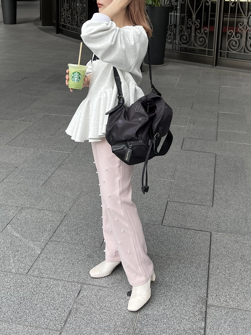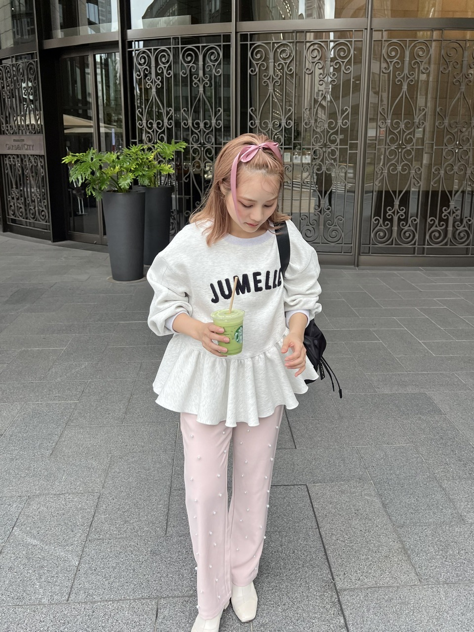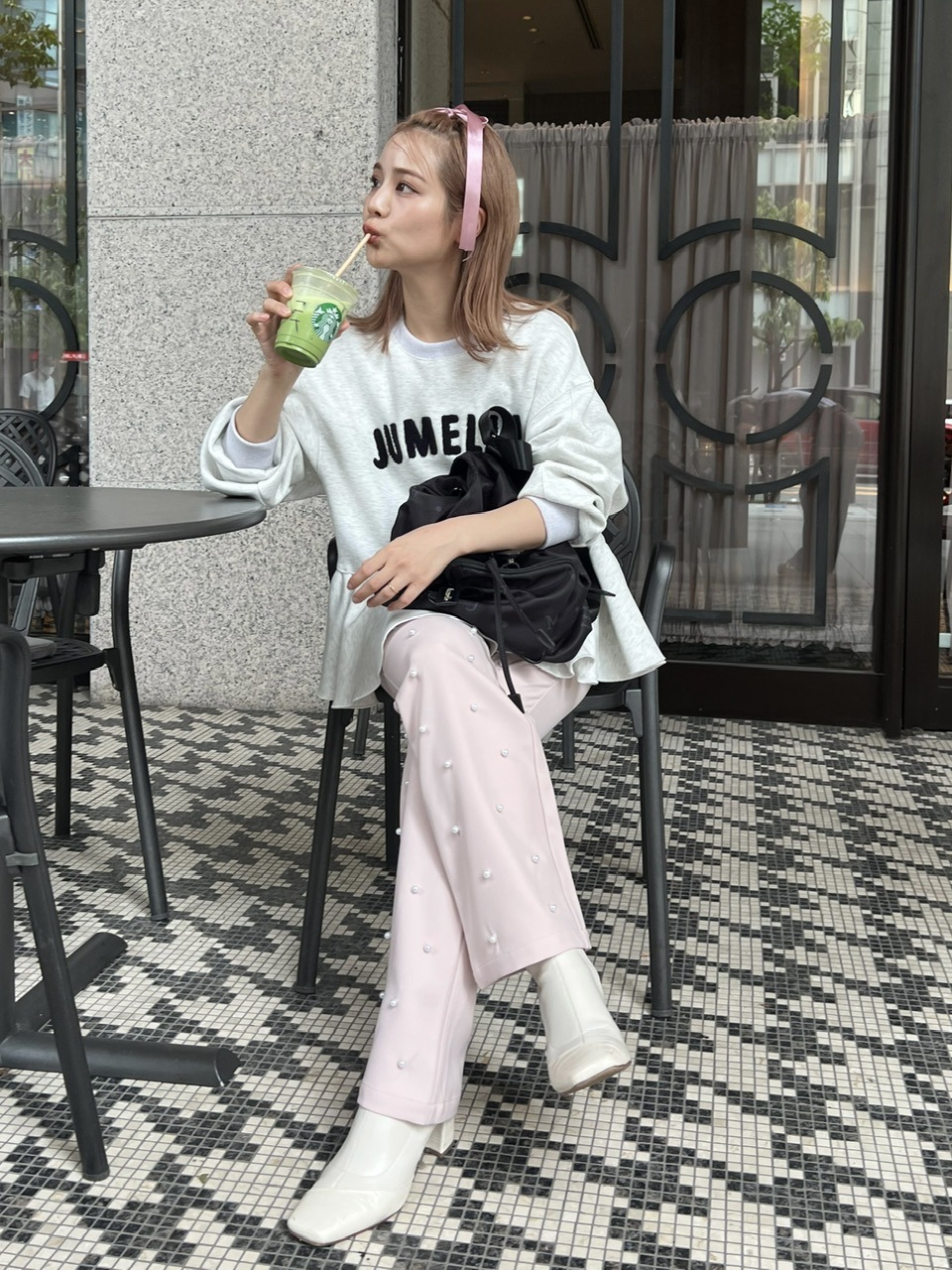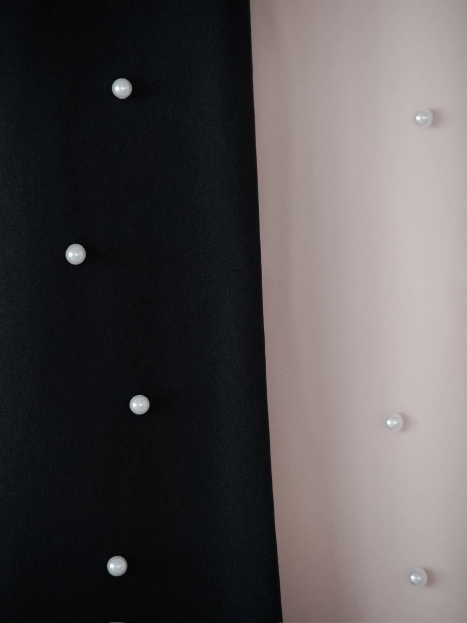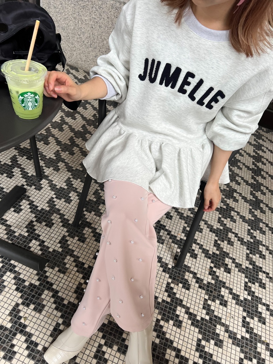 パールの装飾を施したスラックスパンツ。
