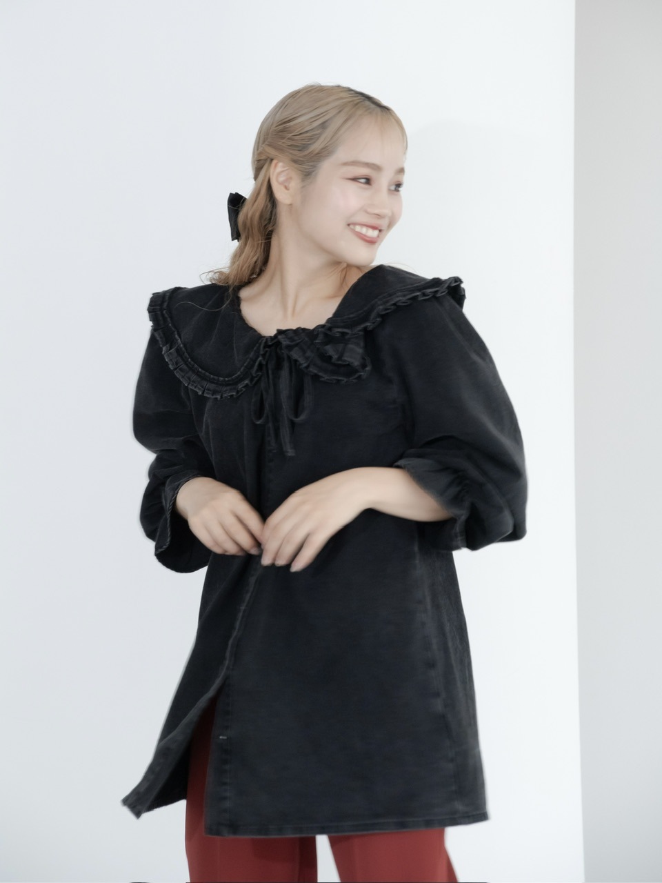 襟は立体感が出るように好きな位置で絞れるスタイルに。