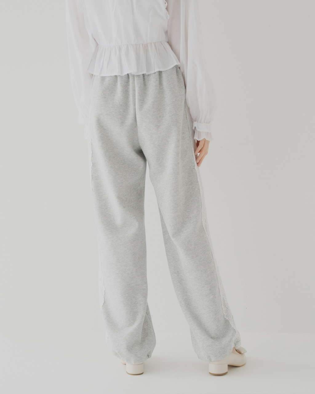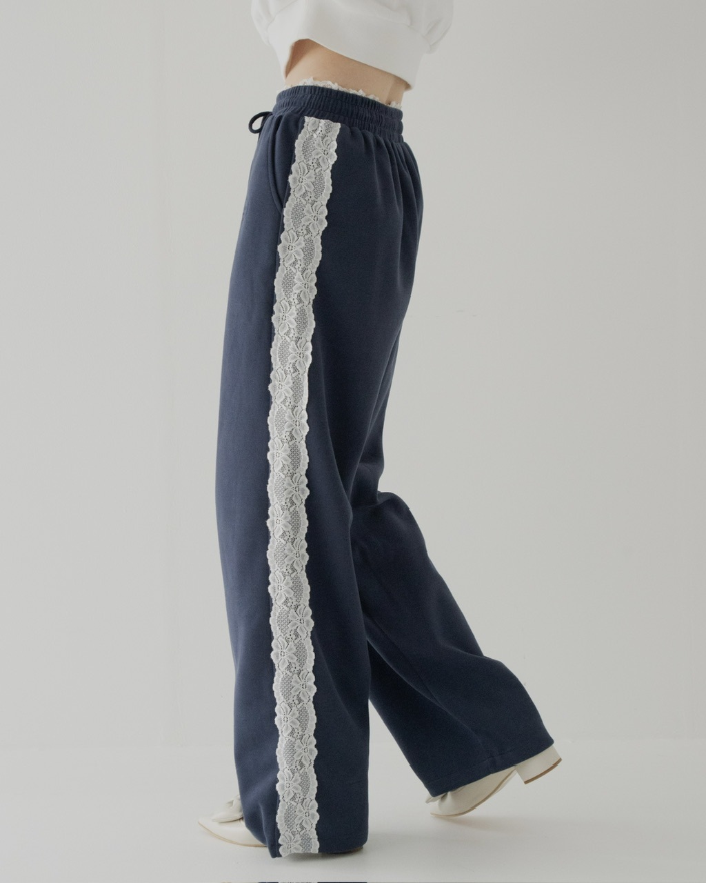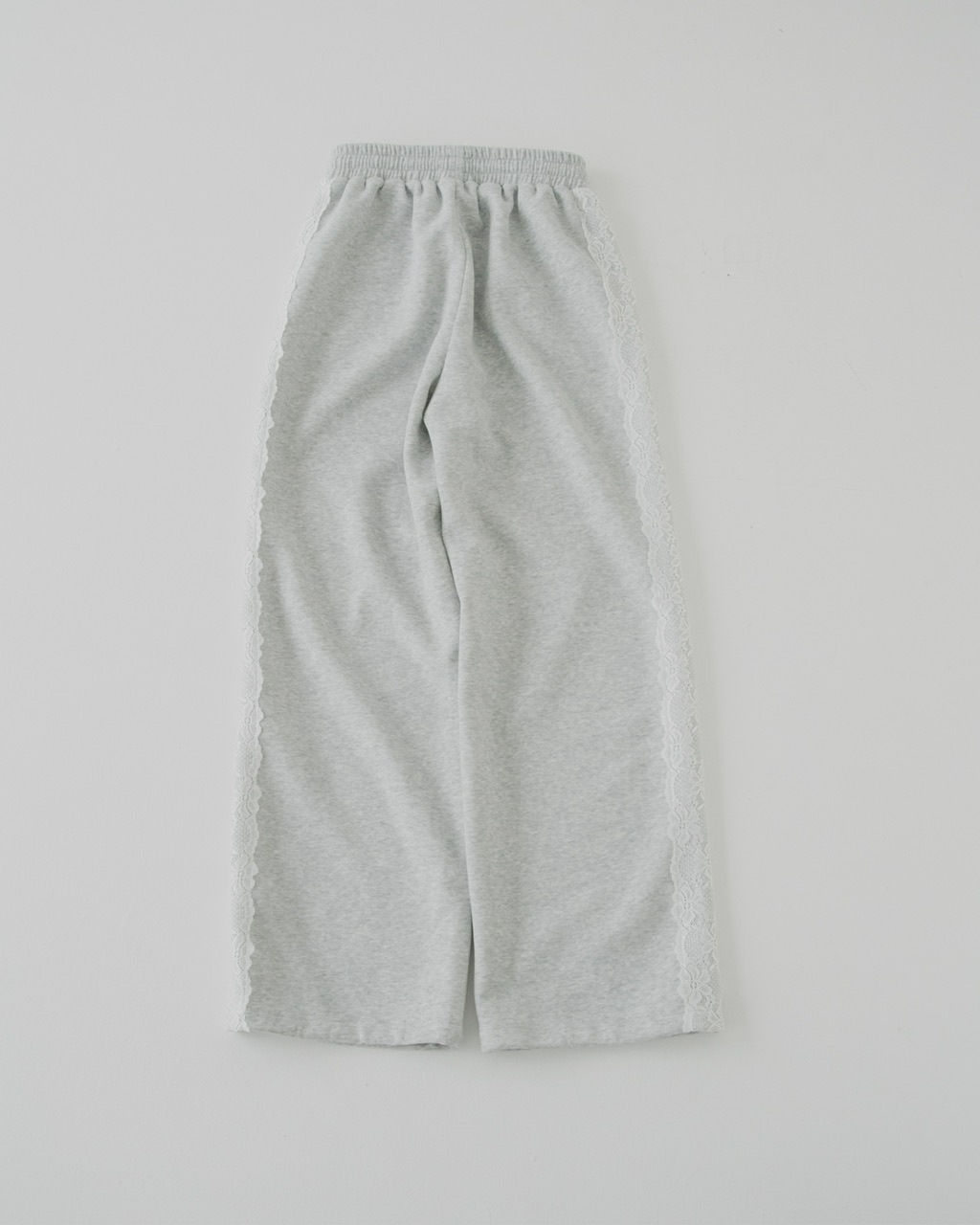 サイドに施したレースが印象的なスウェットパンツ。