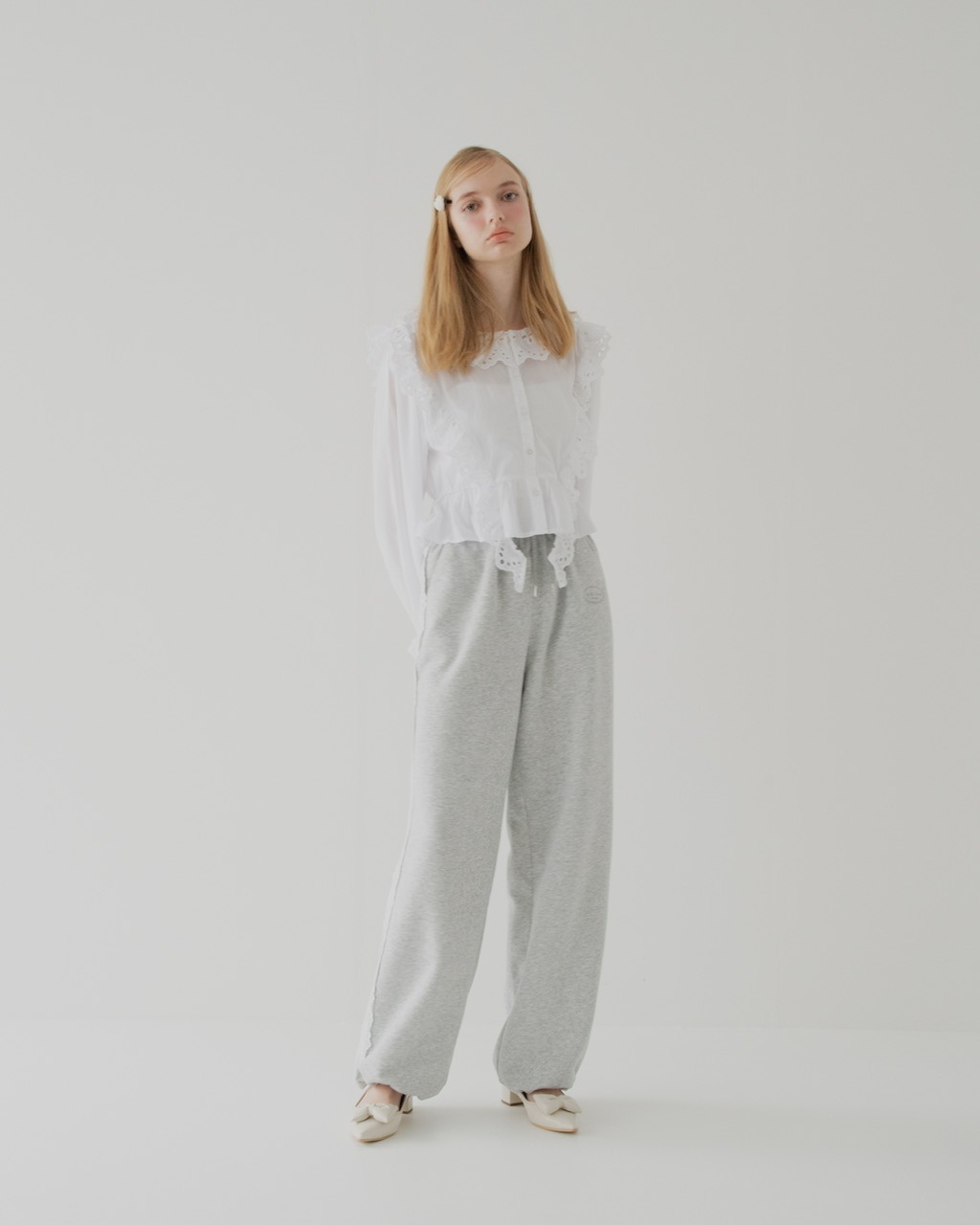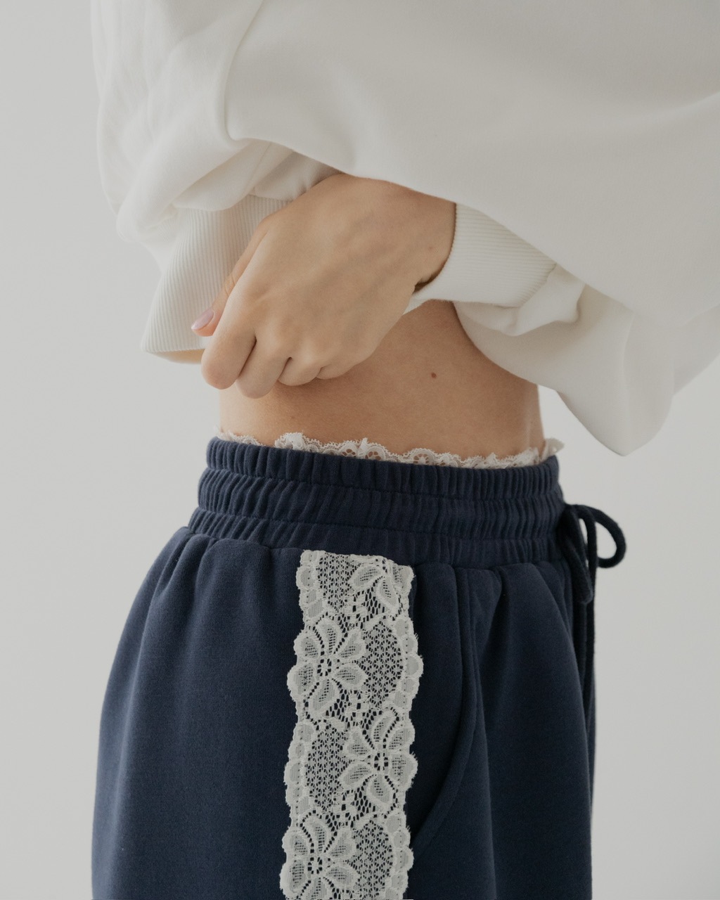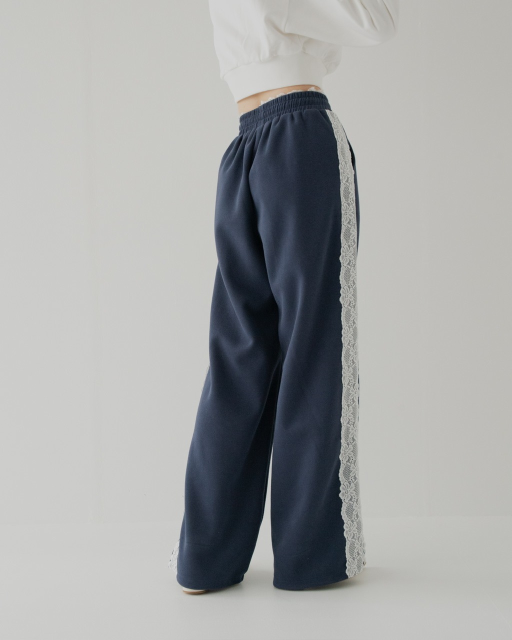 サイドに施したレースが印象的なスウェットパンツ。